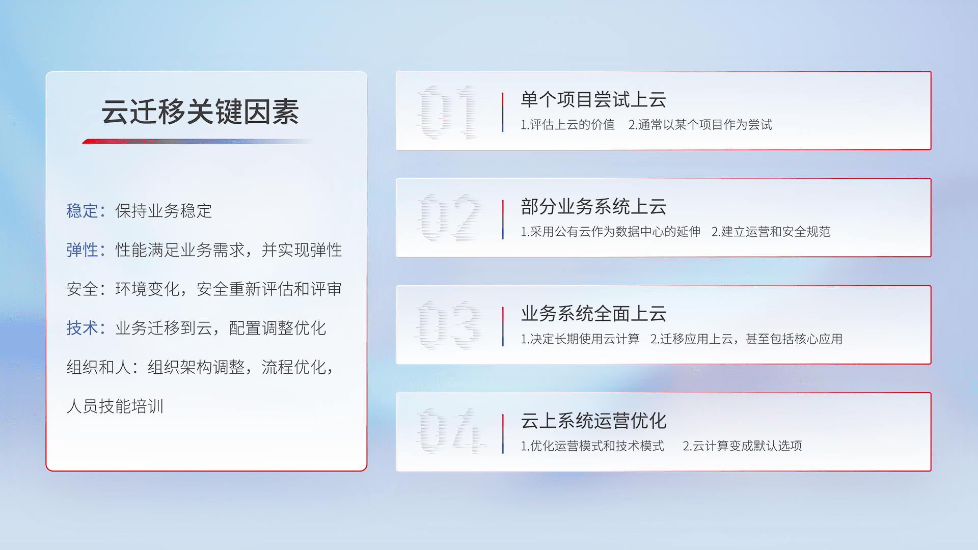 结合实际业务,,,从规划设计、、、、云平台选型、、、云原生改造、、、、数据迁移、、、集成交付,,,迁移全过程为客户识别最佳上云路径,,,做好风险识别管理,,,设计网络架构、、、身份权限、、、、安全审计合规、、操作审计、、、、日志审计、、、、监控告警策略、、、、多站点容灾设计等,,,对云上基础设施进行整体规划,,提升IT治理水平,,,以满足弹性、、高可用、、、高性能的需求。。