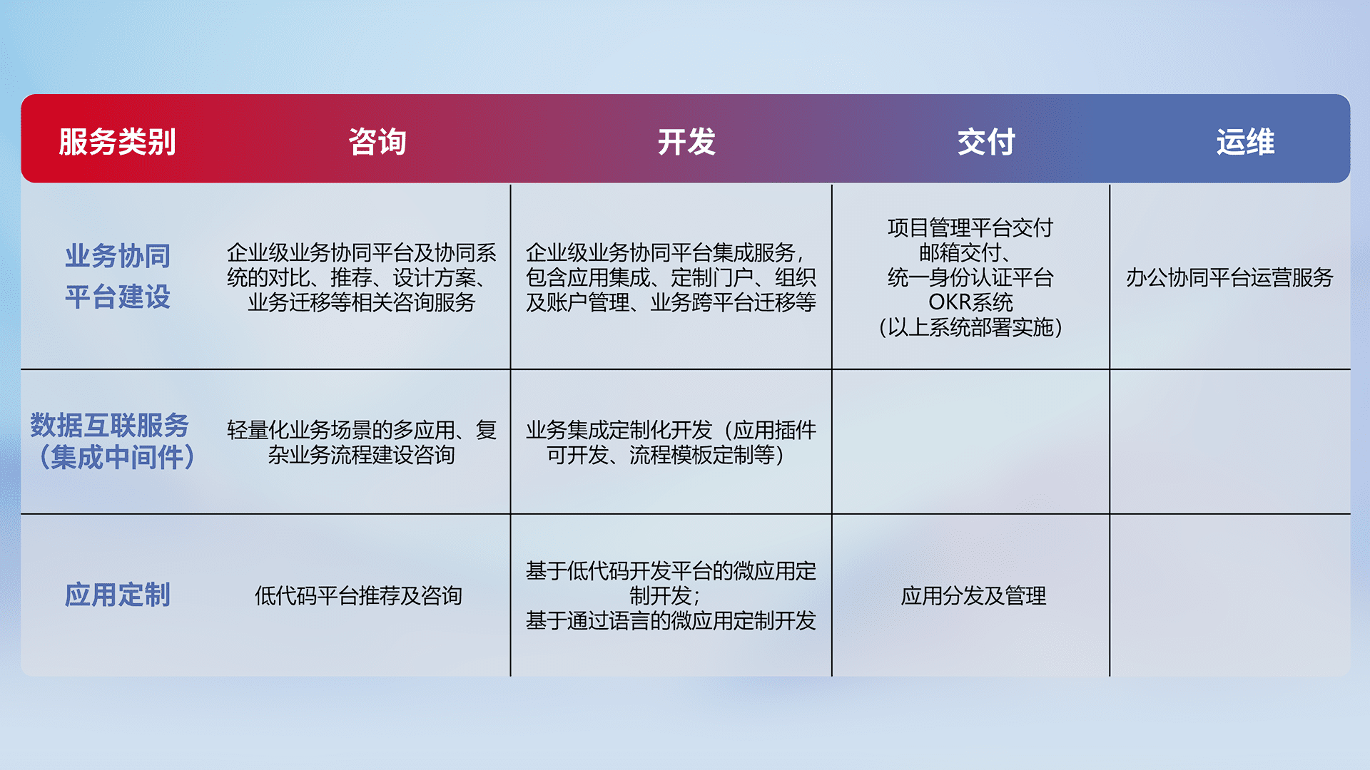 针对钉钉、、、、企微、、、、IDaas等平台级产品提供产品的规划、、、、方案、、、、交付、、定制化开发等服务,,实现如统一协同办公、、、、智能客户服务、、混合会议管理、、、、智能数据查询、、等业务场景,,,实现数字化转型。。